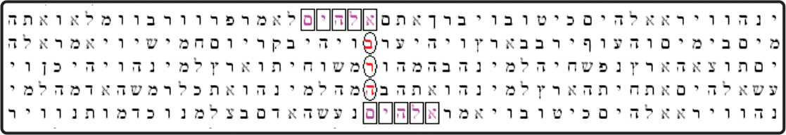 Cu prima literă, א, din numele lui Avraam începe în versetul 22 numele lui Dumnezeu, אלהים , iar ultima literă, ם, din numele lui Avraam încheie numele lui Dumnezeu, אלהים , din versetul 26.