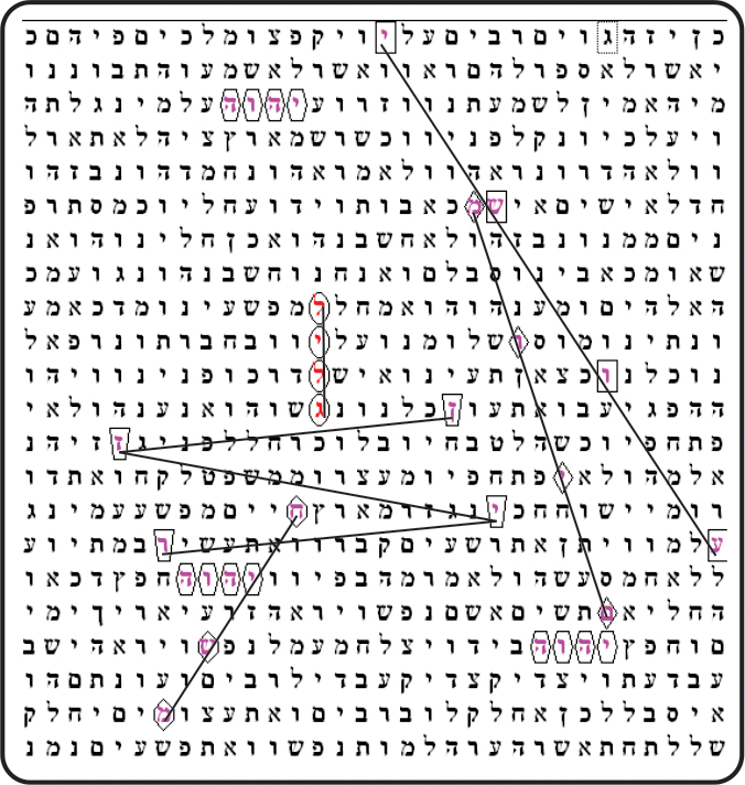 În Isaia 53, 11, începând cu a cincea literă din al nouălea cuvânt și continuând cu fiecare a douăzecea literă de la stânga la dreapta, citim Ma`al Yeshua Shmee ohz, ,מעל ישוע שמי עז o frază care înseamnă „extrem de înalt, Yeshua este numele Meu puternic”. Această frază nu se mai găsește nicăieri în cartea Isaia. Şansele ca această frază să se formeze din întâmplare sunt mai mici de unu la un milion. De la litera yod, י, din numele Yeshua, continuând înapoi cu fiecare a douăzeci și opta literă, citim Ioan (Yochanan), יוחנן . În Isaia 53, 11, începând cu prima literă din primul cuvânt și continuând cu fiecare a patruzeci și doua literă de la stânga la dreapta, citim Mesia (Mashiach), משיח . De la litera mem, מ, din cuvântul Mesia, continuând cu fiecare a douăzeci și treia literă de la stânga la dreapta, citim Maria (Miryam), .מרים