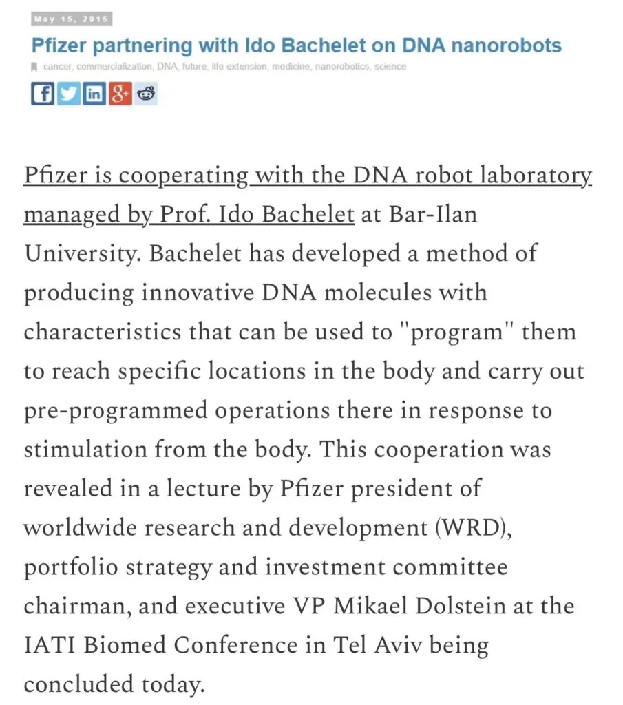 O cercetare profundă în istoria tulbure a Pfizer dezvăluie că s-au asociat cu un israelian pentru a dezvolta nanoroboți programabili care să fie injectați în oameni pentru a le modifica ADN-ul, a le emite o adresă IP și a le conecta la internet.