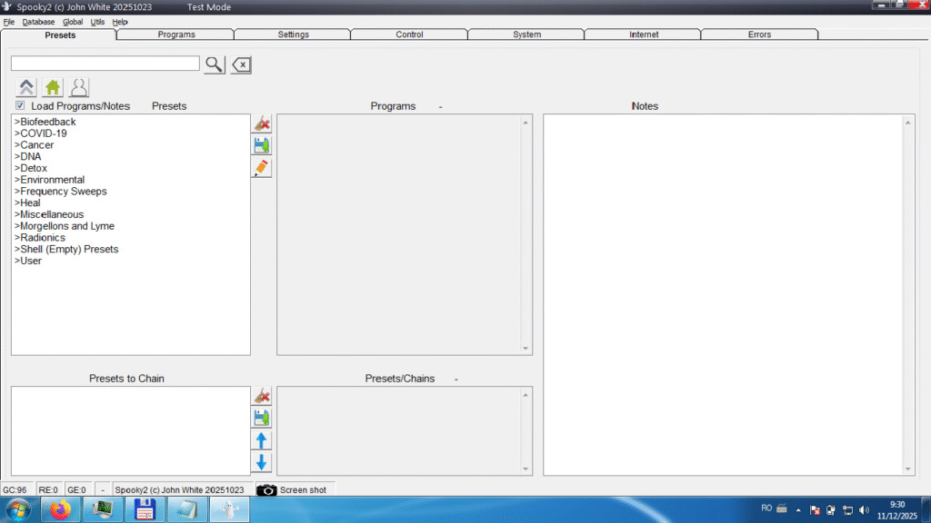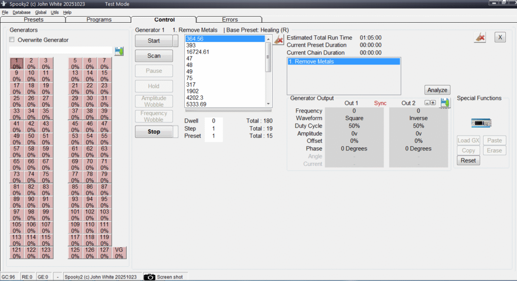 Noi am încărcat programul DETOX Terrain (R) – BY care se derulează pe parcursul a 11 zile. Putem vedea că în prima zi se rulează „Remove Metals” (eliminare metale grele), a cărei secvență de frecvențe durează 1 oră și 5 minute. de asemenea, în imagine se poate vedea și o parte din lista de frecvențe care vor fi folosite.